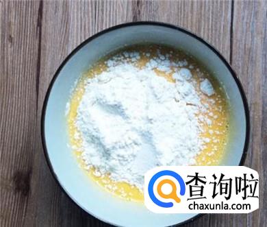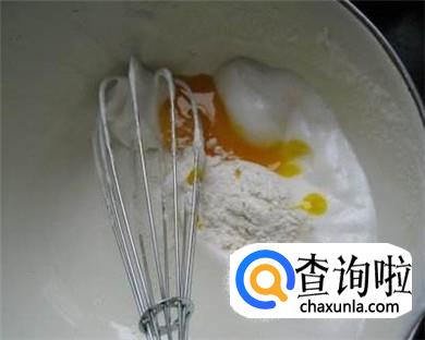 在蛋黄里加入牛奶、低筋粉,搅拌成糊状。