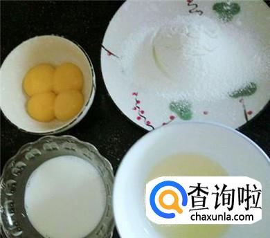 准备低筋粉,橄榄油,鸡蛋,牛奶,白糖。