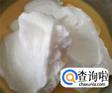 在蛋清里加入少许橄榄油、白糖,用电动打蛋器打发成奶油,加入到蛋黄糊中,用小铲子慢慢上下翻动。