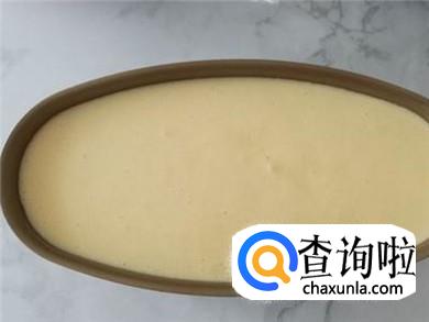 将混合好的蛋糕液放进容器中,放入烤箱中,设定好时间和温度,大约四十分钟后,用筷子扎一扎,筷子上没有蛋糕液了,说明烤熟了,可以拿出来品尝了。