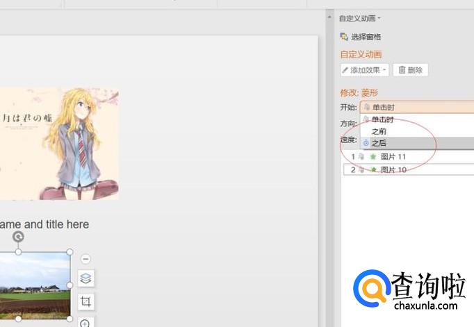 然后选中第二张图片,同样为图片增加一种动画效果,与第一张不同的是,在开始动作的选项中选择之后