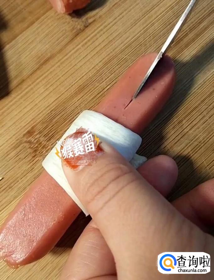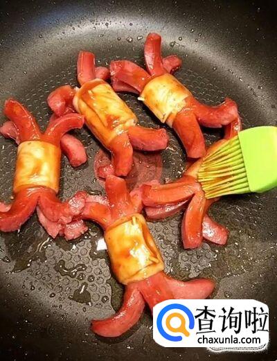 接着我们用牙签将鸡腿菇固定在烤肠上面,把烤肠改下花刀