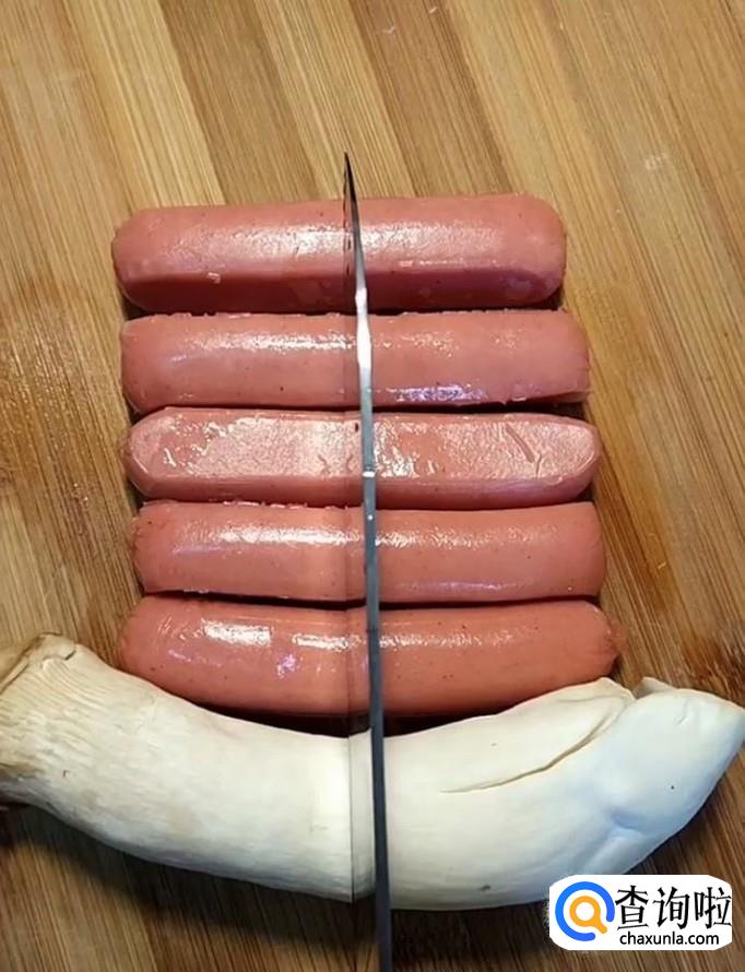 然后我们将鸡腿菇切成片,把烤肠卷起来