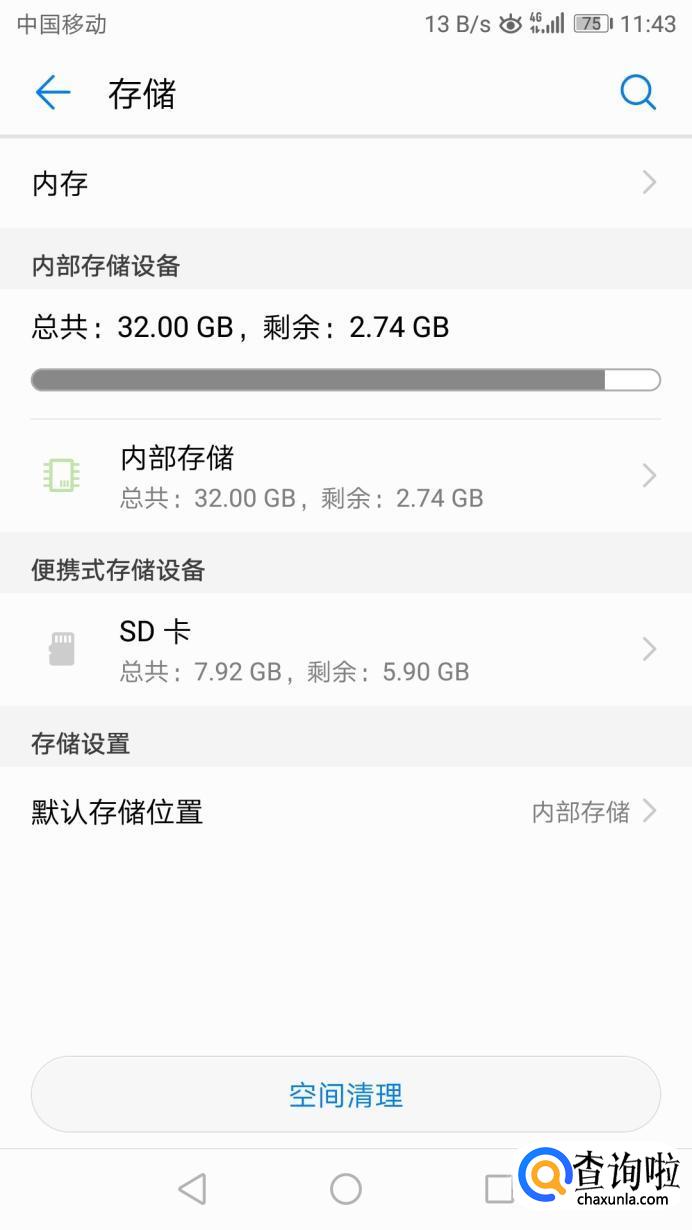 进入“存储”页面找到“存储设置”,然后把默认存储位置变更为SD卡。