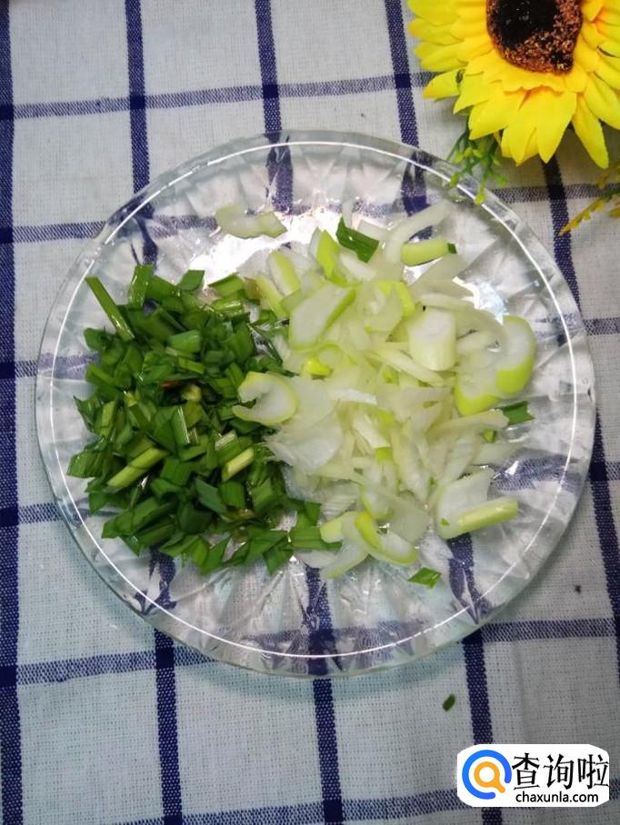 将蒜苗和葱切碎,再将焯好水的西兰花和胡萝卜切碎,放在一起。
