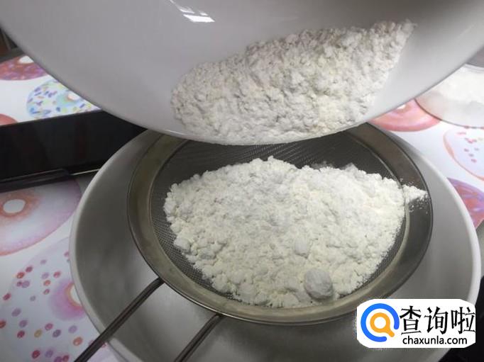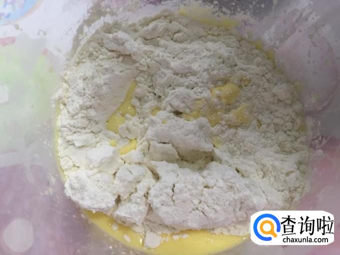 将低筋面粉倒入蛋黄液中,用手动打蛋器搅拌均匀。