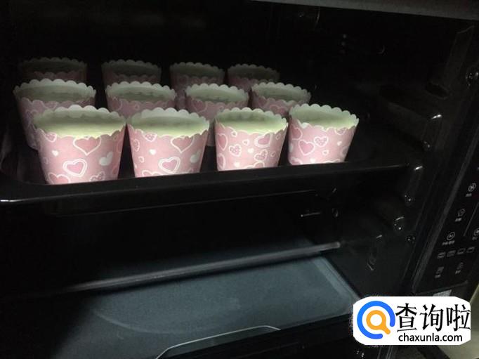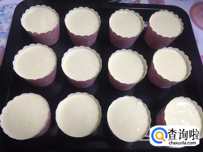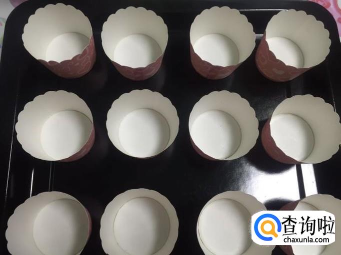 准备好小纸杯,并将蛋糕液倒入纸杯中。