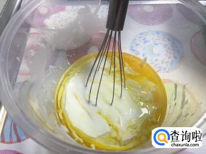 在蛋黄中倒入玉米油和酸奶,用手动打蛋器搅拌均匀。