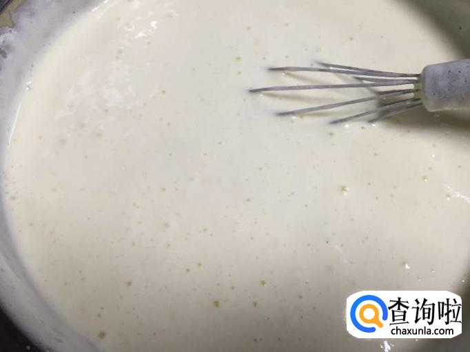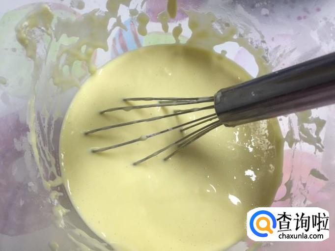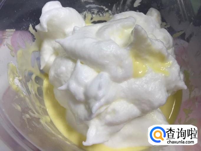 将蛋白分3次加入蛋黄液中,并用手动打蛋器搅拌至均匀。