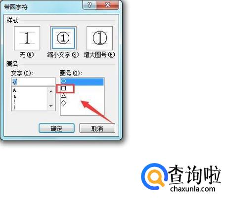 点击带圈字符选项,在弹出的对话框内选择圈号里的方框选项,如图所示: