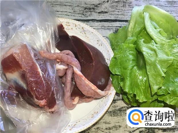 准备好煮粥的食材:猪肝适量、粉肠一根、瘦肉适量、生菜一颗。