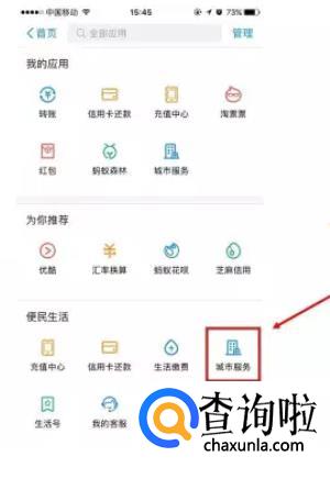 查询名字的功能是从“城市服务”这个版块进去,如果你之前将它添加到首页,那么现在可以直接点进去。