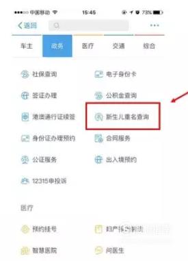 我们点击“政务”,在右边第3个就是“新生儿重名查询”
