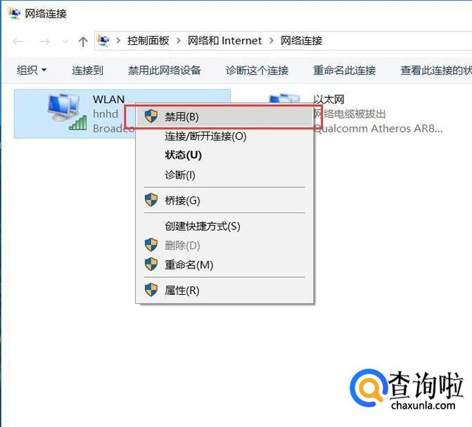 如果网络诊断功能仍然修复不了该问题,我们可以尝试对无线网络适配器击右键,选择“禁用”按钮。