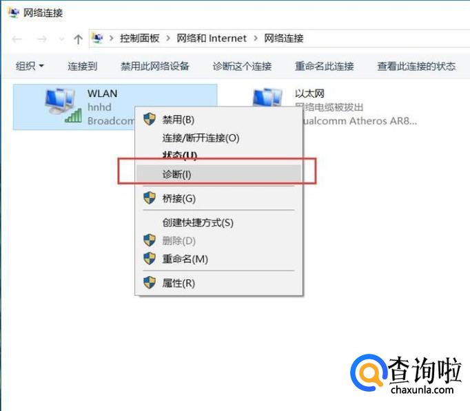 接下来,我们对着无线网络适配器击右键,选择“诊断”选项。