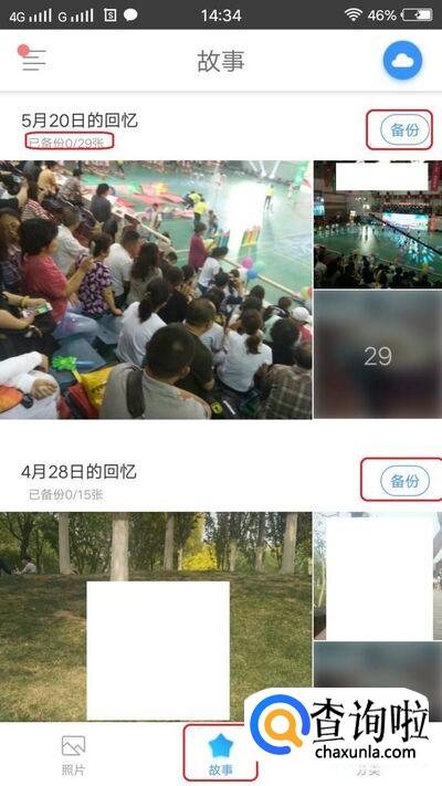 打开该软件,我们进入这样的界面,我们点击下部的“故事”按钮,可以看到里面把同一天拍摄的照片都分别存放,只要一键备份就可以整理了。