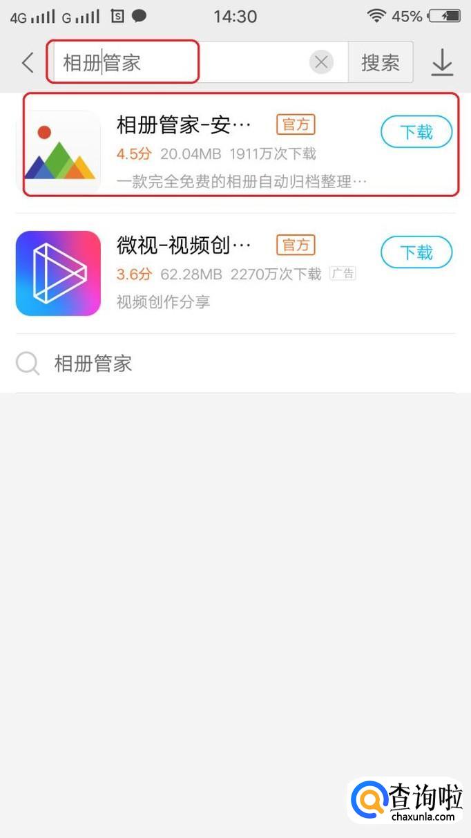 在应用里面搜索“相册管家”,下载并安装到自己的手机上。