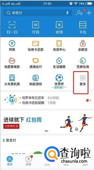 打开支付宝,在首页会出现我们常用的应用,这时候我们点击“更多”如图所示: