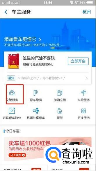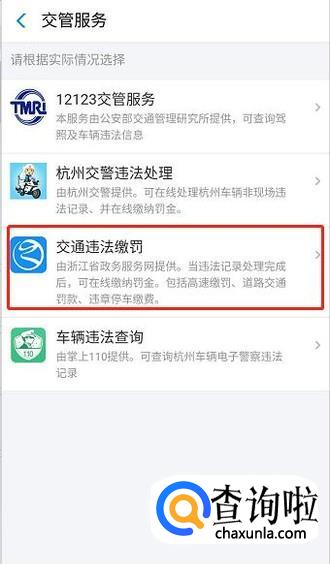 然后找到“交管服务”选项找到“交通违法缴罚”然后根据自己爱车的违章记录进行缴费就可以了!