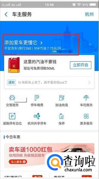 进入车主生活后可将自己的车辆信息与支付宝绑定,点击页面头部的“添加爱车更懂它”