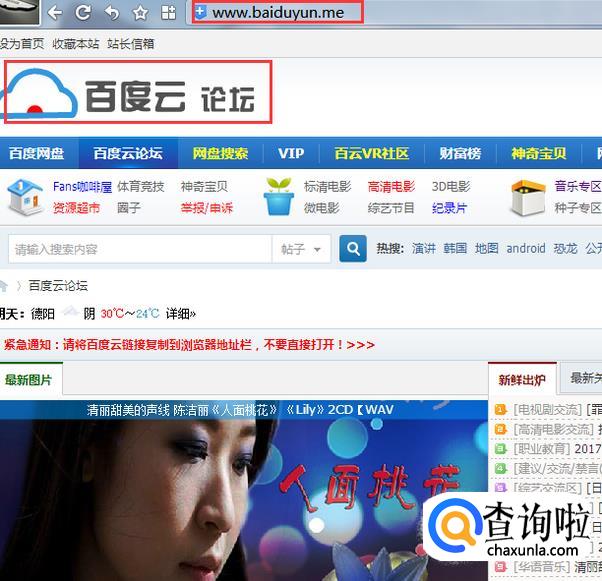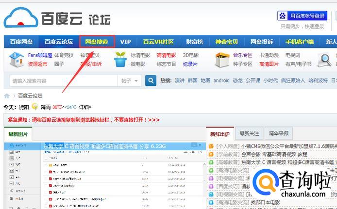 在百度云论坛中有很多最新的资源,我们点击导航栏中的网盘搜索,即可进入搜索界面。