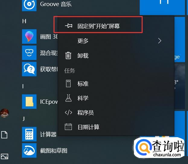 然后鼠标右键单击“计算器”,选择“固定到“开始屏幕””。