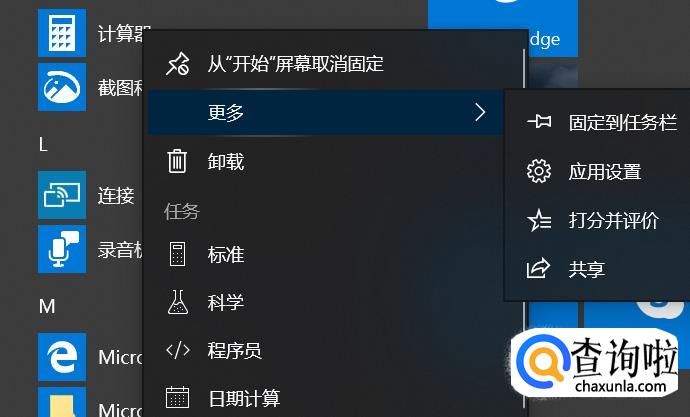 我们还可以把计算器固定要任务栏,这样使用计算器更加方便。还是在开始菜单中找到计算器,右键点击选择“更多”-“固定到任务栏”。设置完成以后,我们就可以在任务栏找到计算器使用了。