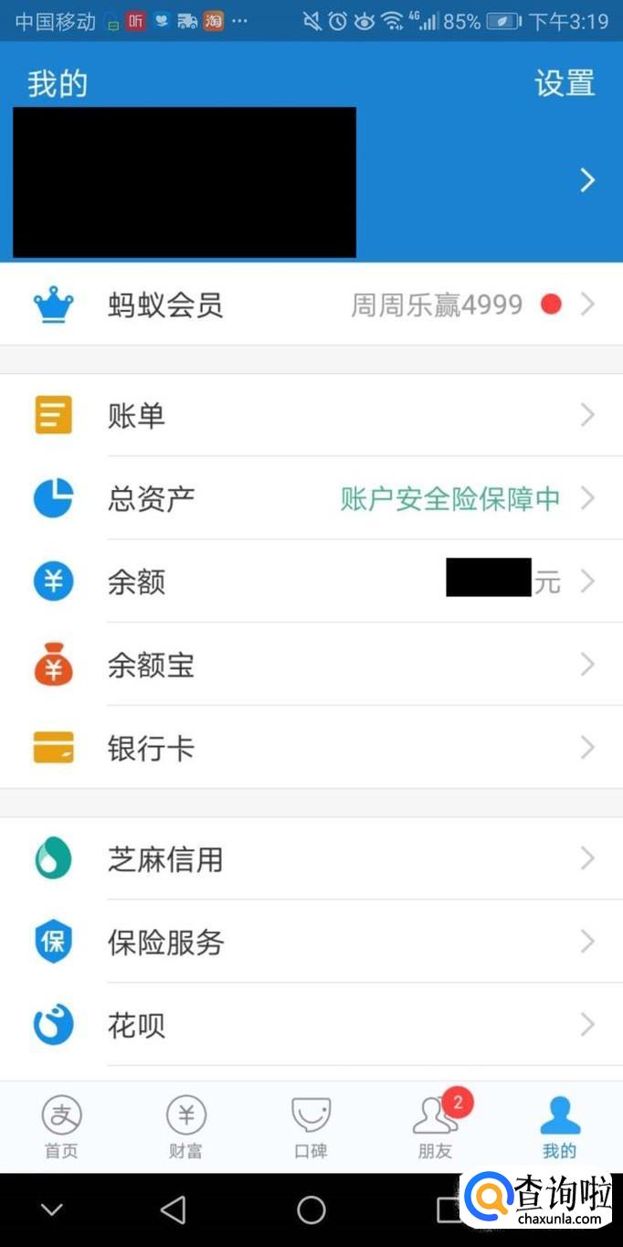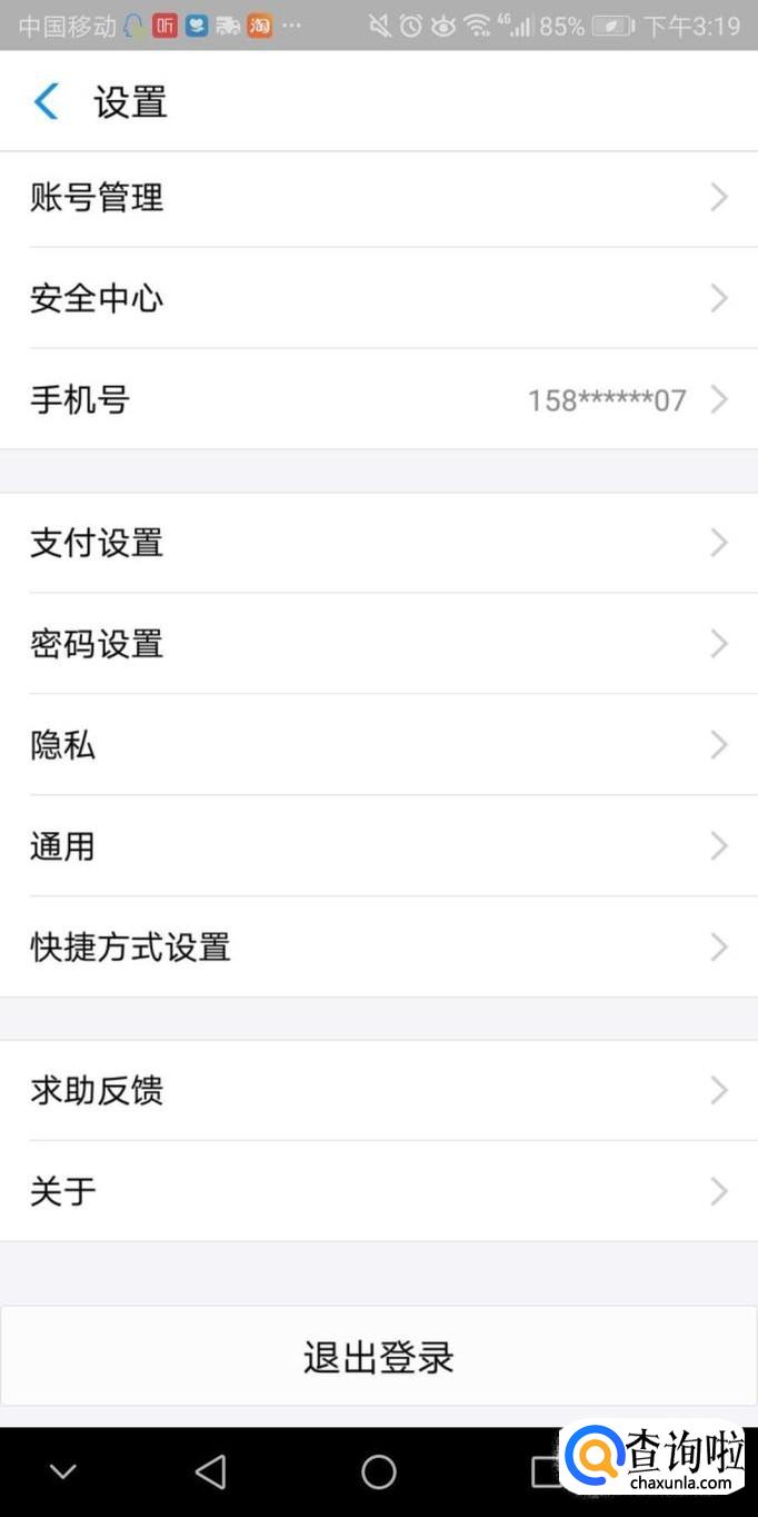 此界面可以查询支付宝余额、芝麻信用等,点击右上角的设置功能进入。