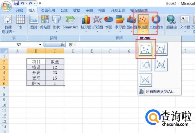 然后我们点击散点图的下拉箭头,弹出的界面,我们点击选择第一个;