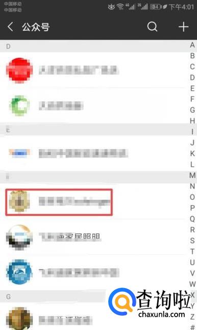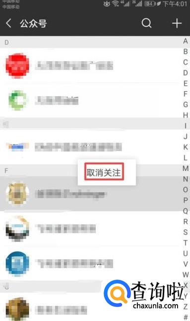 弹出的界面,我们就可以看到很多公众号了,正常情况下我们需要点击进去之后进行取消关注,这是非常慢的,我们直接长按公众号;