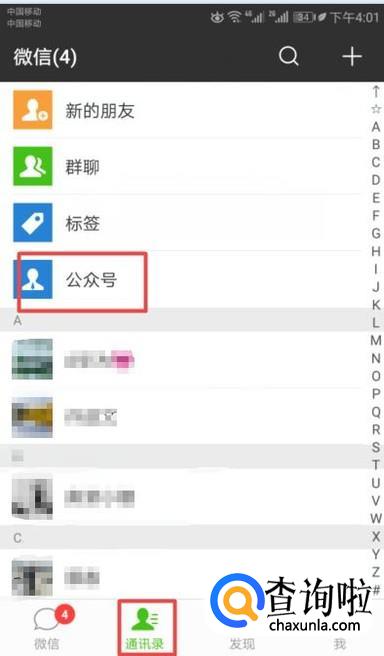 进入微信后,我们点击通讯录,然后我们点击公众号;