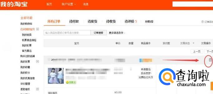 然后选择某一个订单,点击【垃圾桶】进行删除,如下图所示: