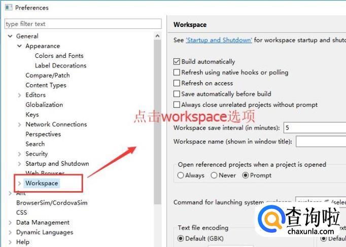 在弹出的Preference界面中,我们展开General选项,然后选择其下面的Workspace选项,如下图所示
