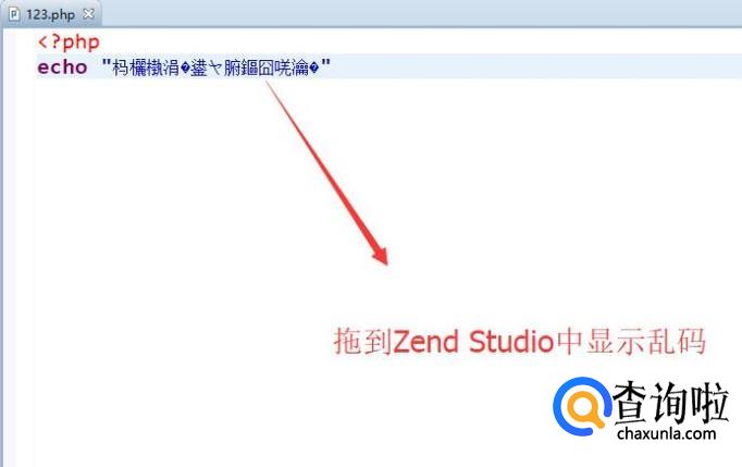 接下来我们将新建的PHP文件拖到Zend Studio软件中,你会看到刚才写的中文变成了一堆乱码,如下图所示