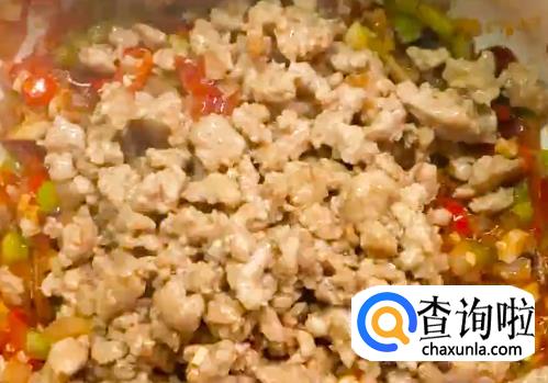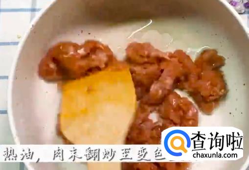 将腌制好的肉末下油锅翻炒,熟了之后捞出盛盘待用。