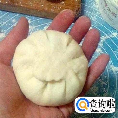 面团醒好之后,搓成长条,揪成一个个面剂子,用擀面杖擀成馅饼皮,比饺子皮稍微大一点,放上肉馅,捏成包子形状然后压扁。
