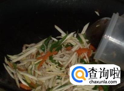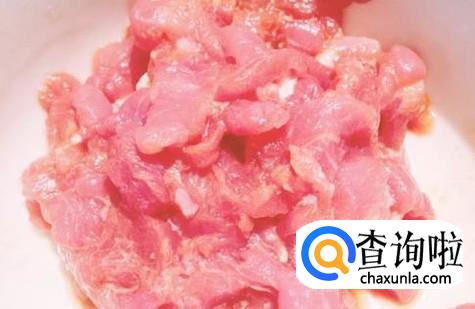 瘦肉切成丝加适量的盐、生抽、料酒腌制几分钟。