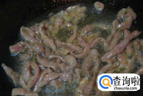热锅下油,放肉丝进去翻炒至变色。