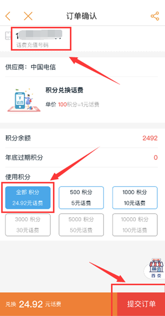 6、确认好手机号码,点击“全部积分”图标,点击“提交订单”。
