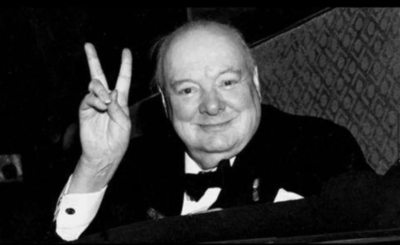 邱吉尔转过身,两指指向天花板,情绪激动地大声回答说:“一定胜利!”。