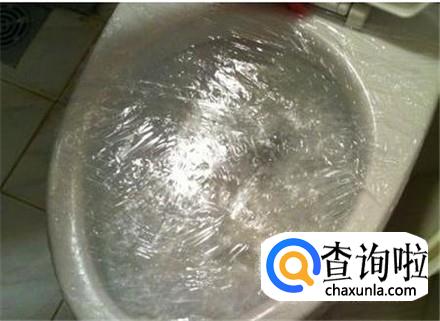 保鲜膜一层层覆盖在马桶上面,要封的密不透风,越密封越好,然后放水在马桶里,水满了之后,将保鲜膜揭开,马桶会瞬间通了的。