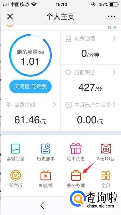 成功登录手机号后往下拉就会看到一个业务办理的功能。