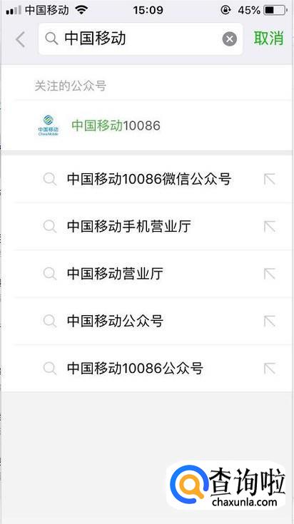 首先我们先在微信公众号里面搜索中国移动并添加,电信跟联通就搜索电信、联通的。