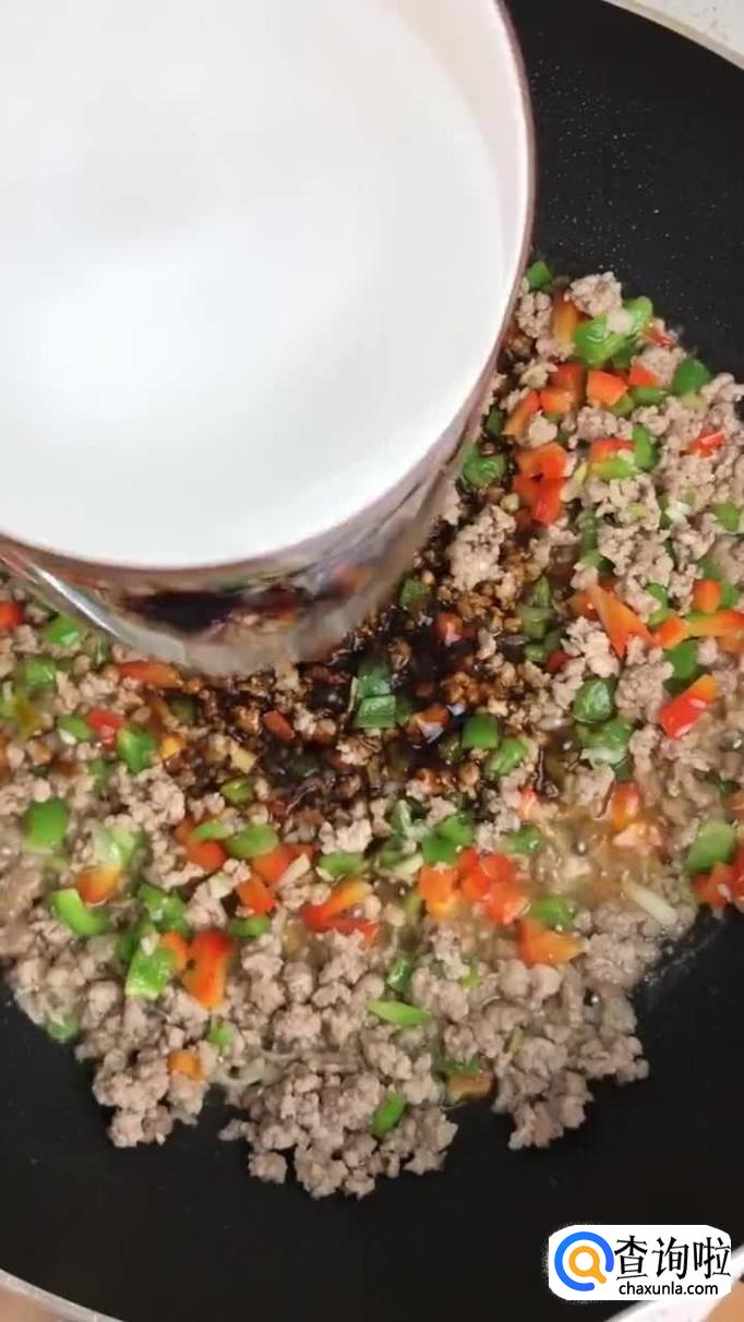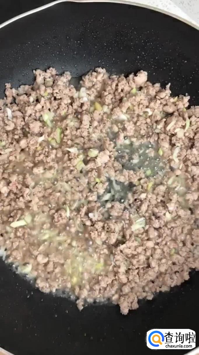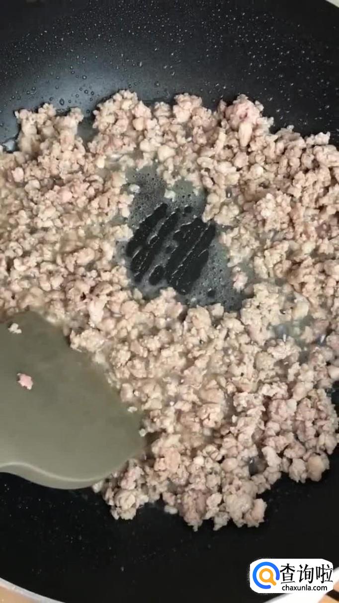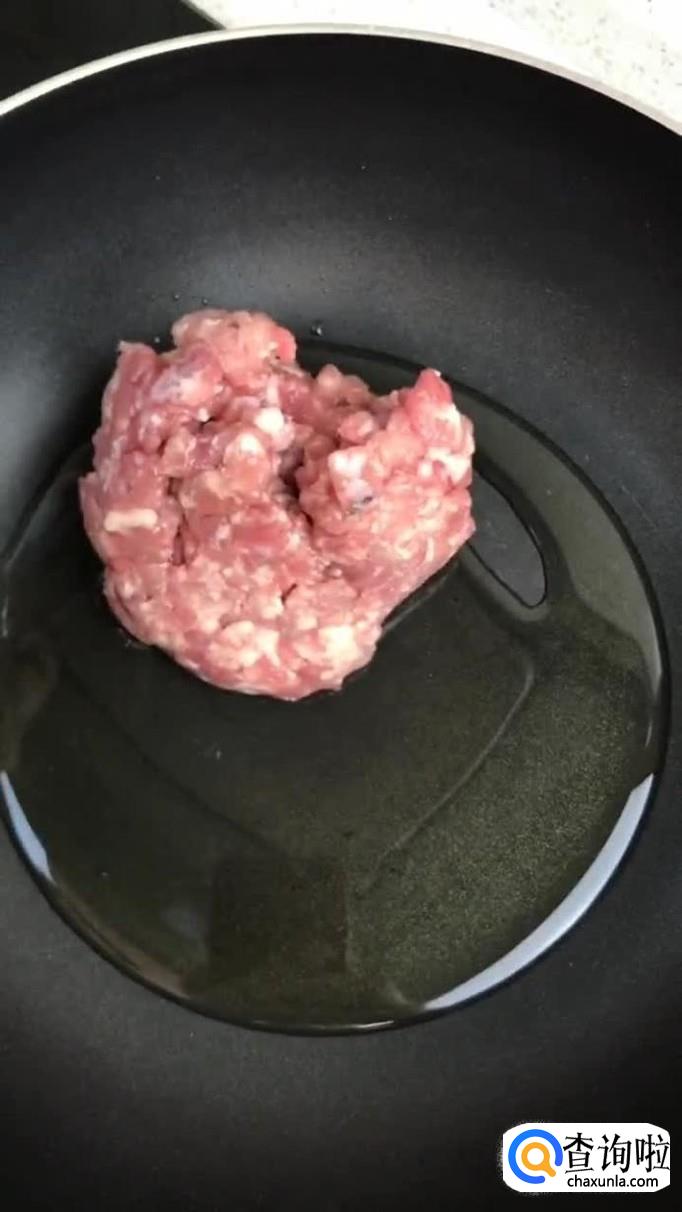接着往锅中加入适量的食用油,把瘦肉沫倒入锅中翻炒三分钟。