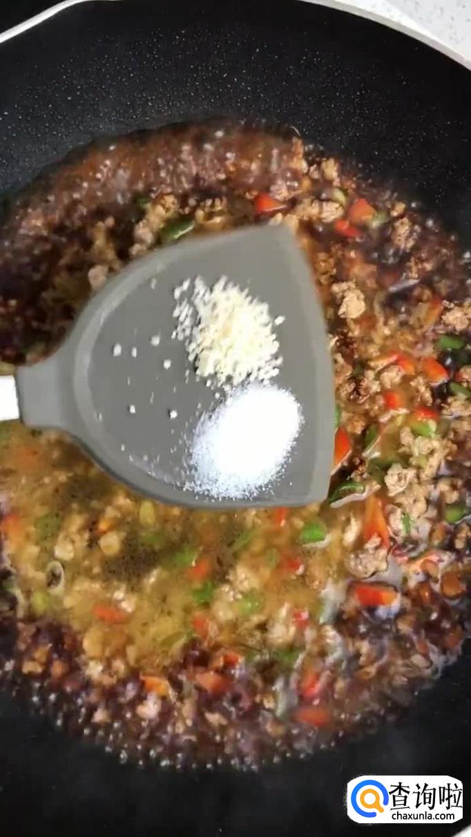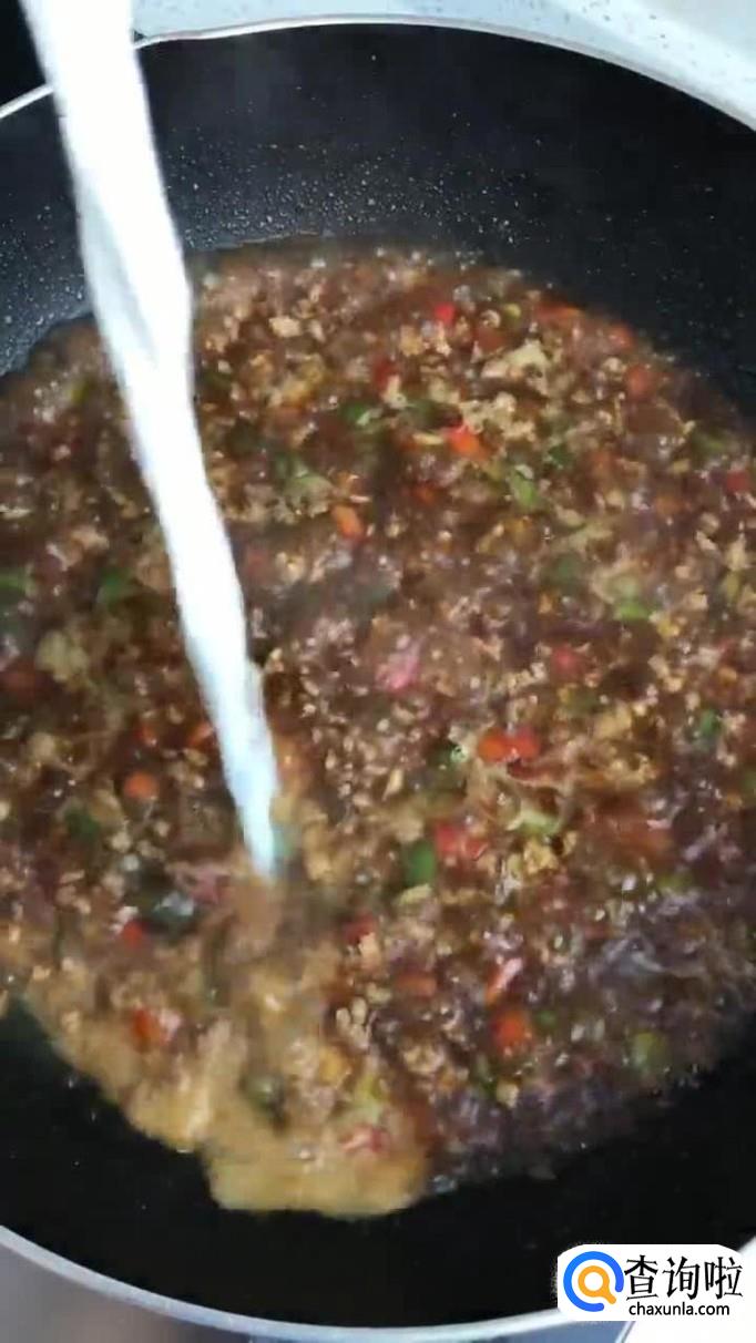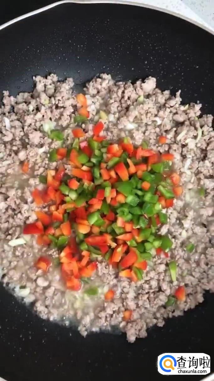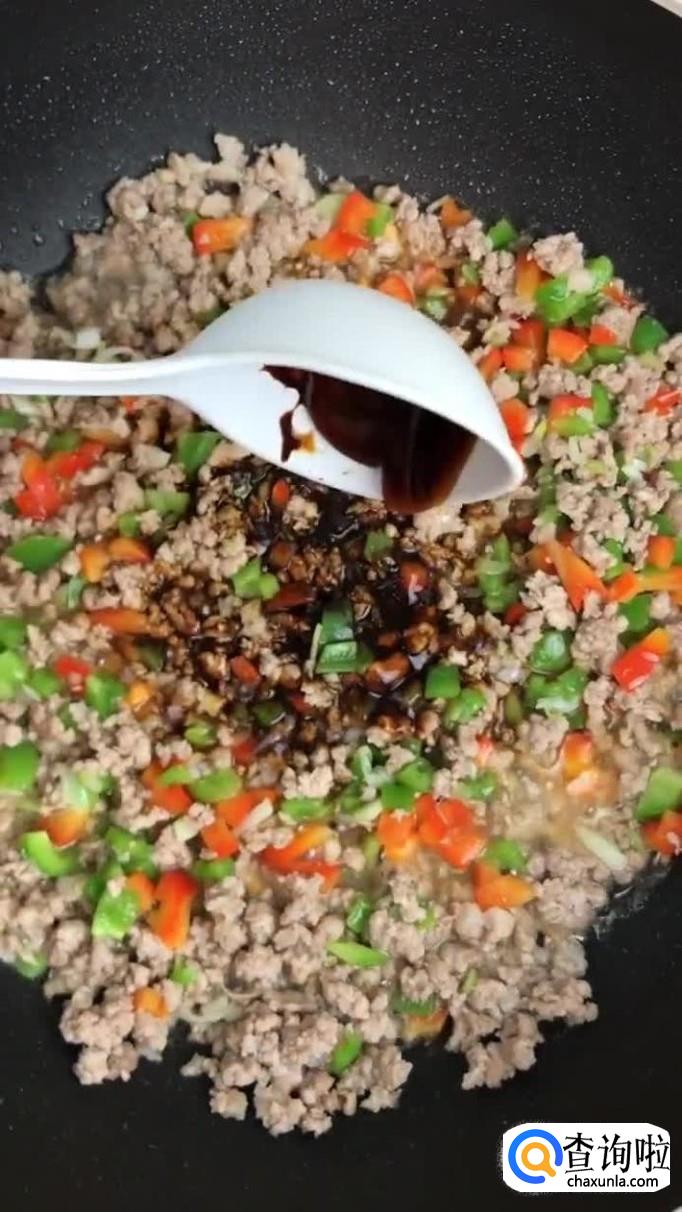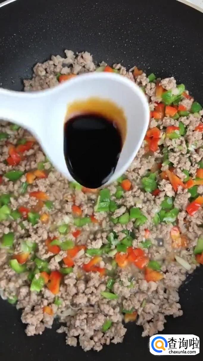 接着往锅中加入适量的食用油,把瘦肉沫倒入锅中翻炒三分钟。
