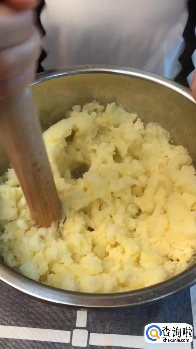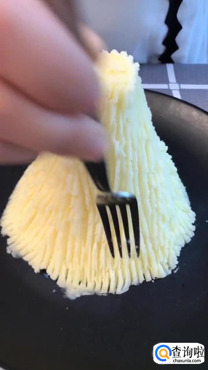 然后把土豆泥用叉子塑好形,如下图所示。