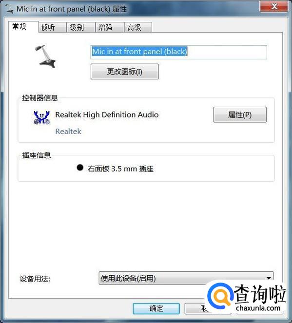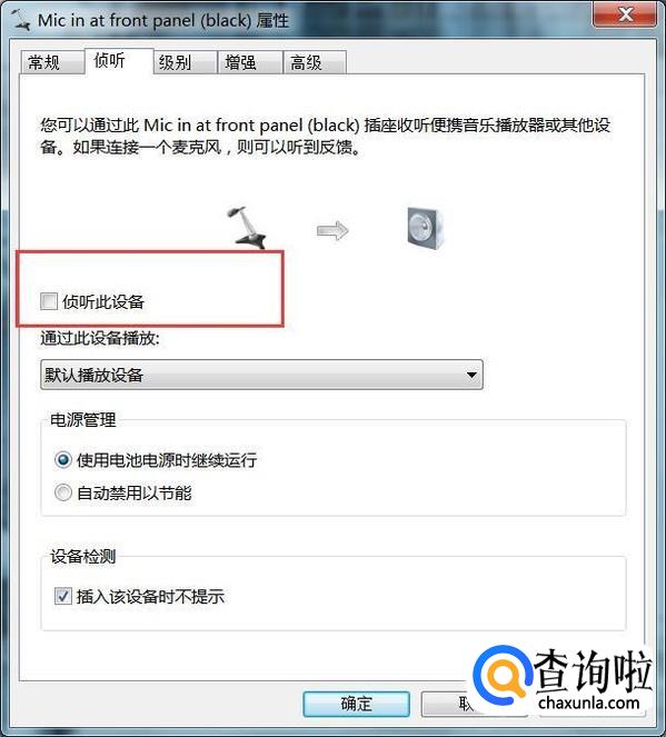 然后我们切换至“侦听”菜单选项,如果你需要在使用麦克风设备时要从扬声器中听到自己的声音,那么就要点击勾选“侦听此设备”选项,否则也不需要设置。