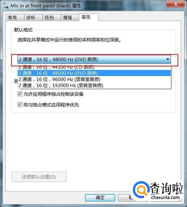 在“高级”设置选项中,一般是用来设置采样频率的,此处的设置一般是针对专业人士使用来开发的,一般我们保持默认设置即可。