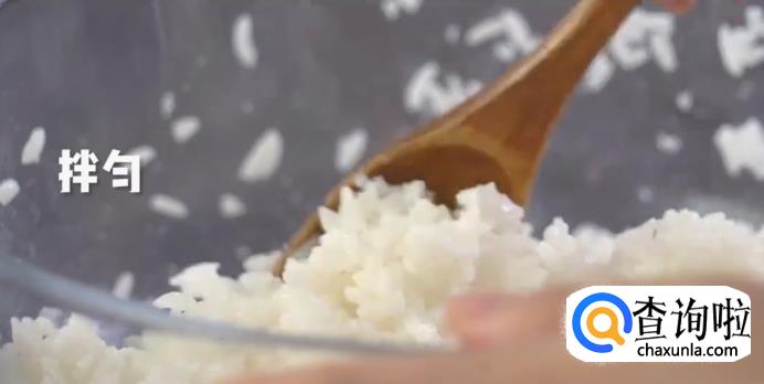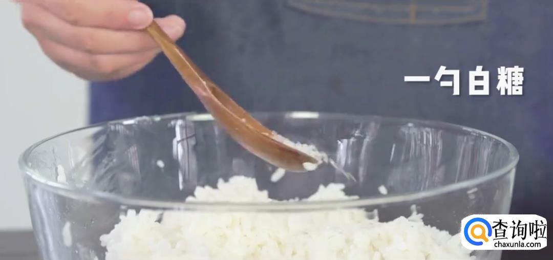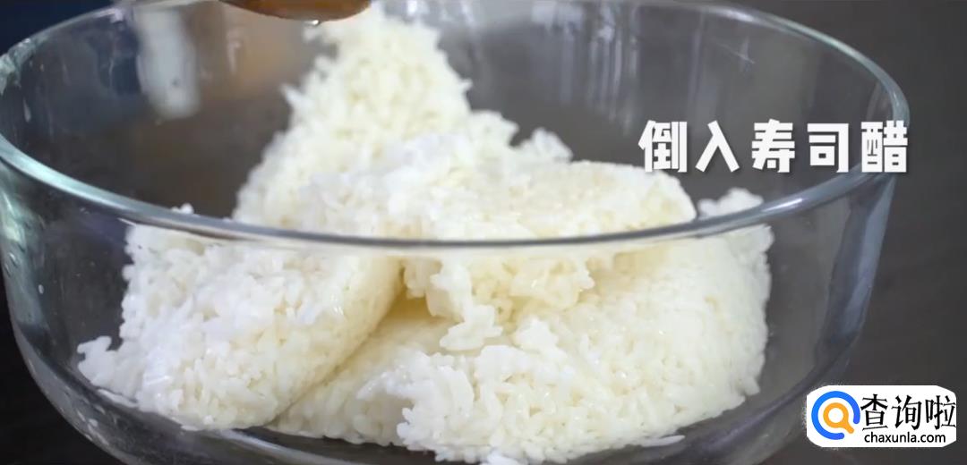 将熟米饭中倒入寿司醋,加一勺白糖后搅拌均匀。