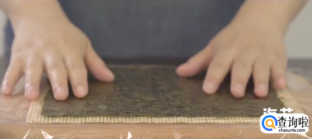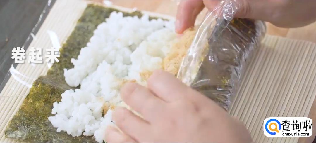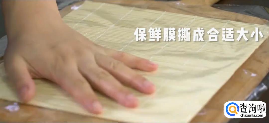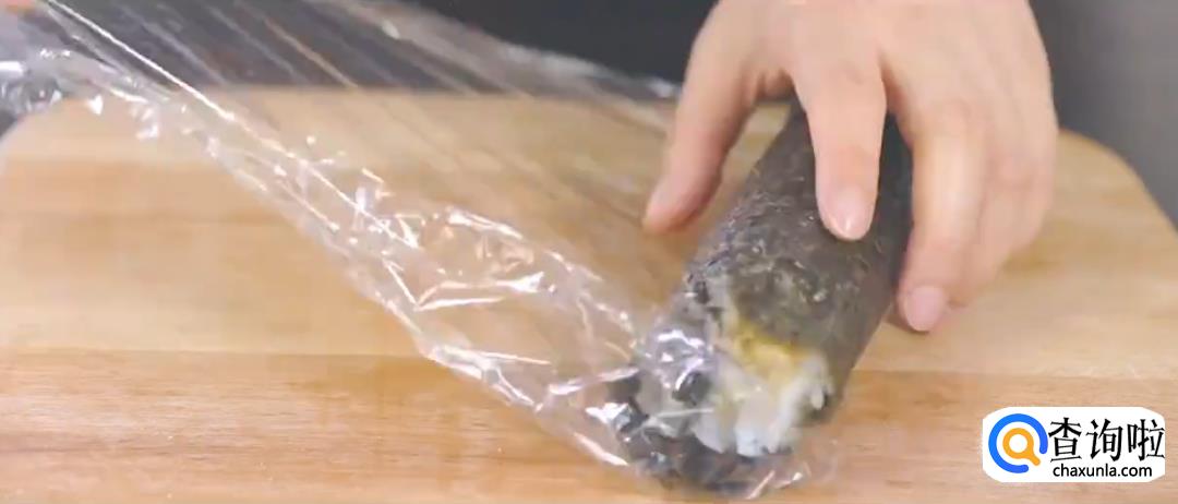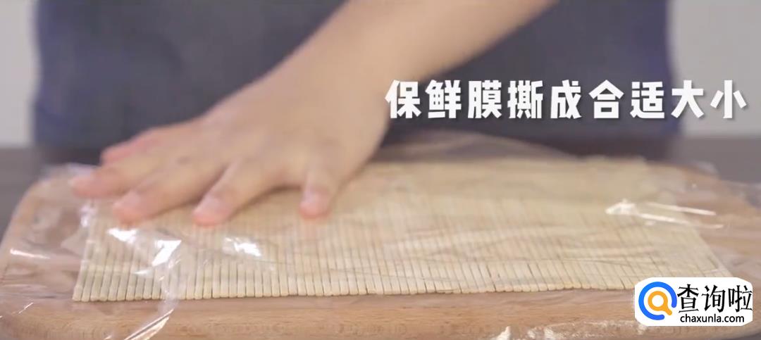 将保鲜膜卷起来,再用寿司帘裹紧,然后松开,寿司卷就完成了。